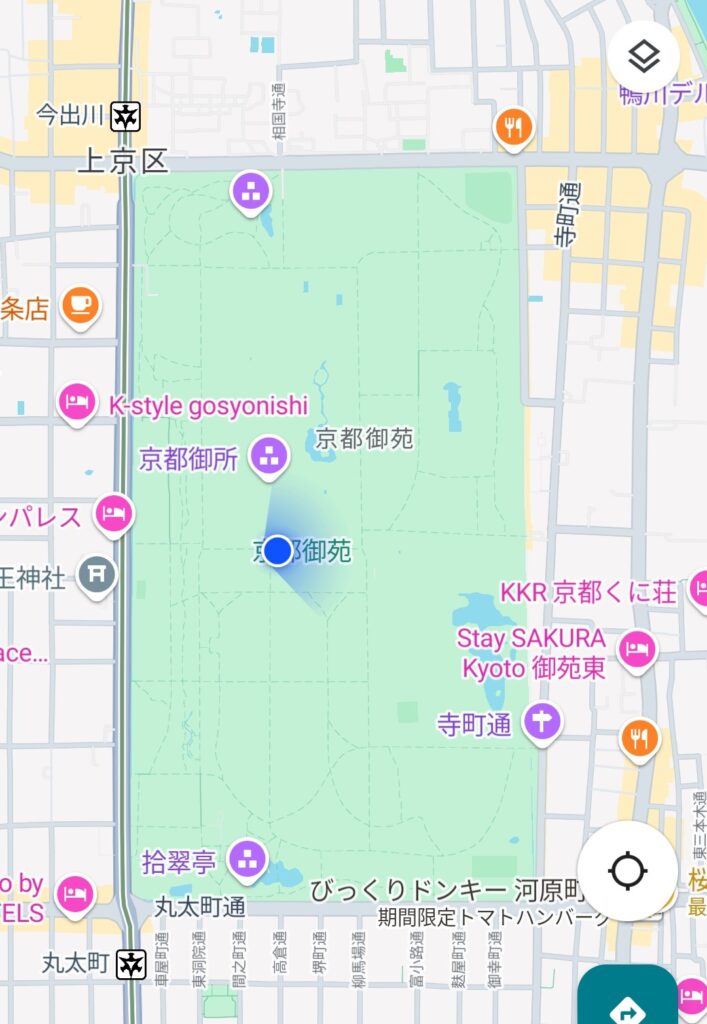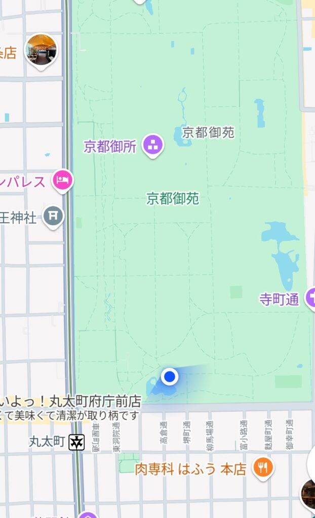 丸太町駅の1番出口から数分、間之町口から京都御苑の敷地内に入り10分弱